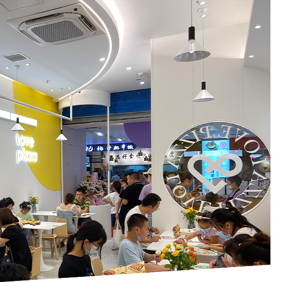 愛八寸品牌從十幾平米到上百平米均可開店,規劃科學,裝修標準??偛繛殚T店配送半成品的披薩餅胚.